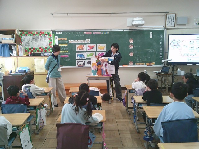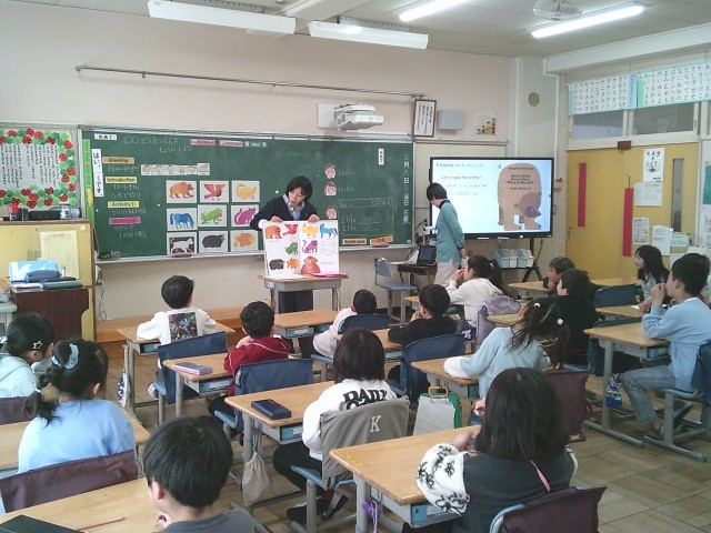9日(月)2時間目、1年1組は外国語活動の時間でした。担任の先生とMEPSの先生とで授業をしました。子どもたちは英語の大型絵本を読んでもらいながら、色や動物の表現を思い出しました。後半は、「○○動物園」を作りました。