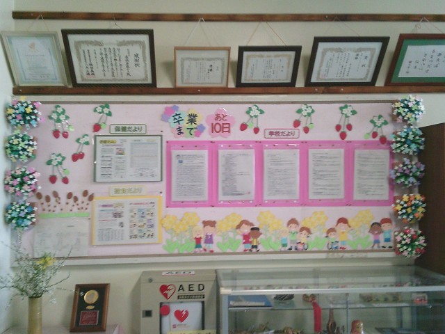 職員用玄関にある掲示板の写真です。先週は「ひなまつり」の飾りがありました。今週からは「卒業」と「春」がテーマのものに変わりました。季節感を出すために、スクールサポートスタッフが毎回様々なアイデアを出しています。