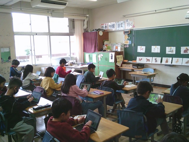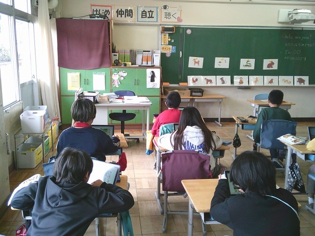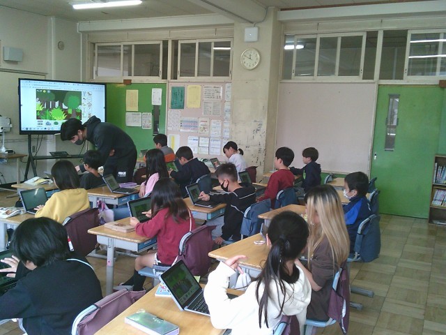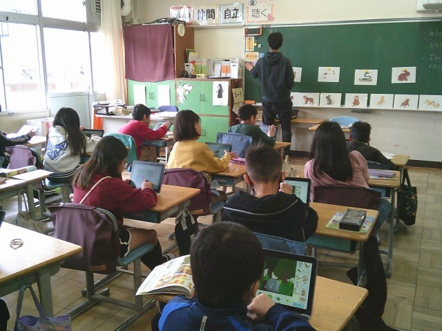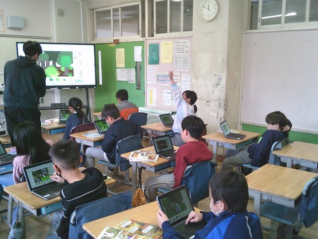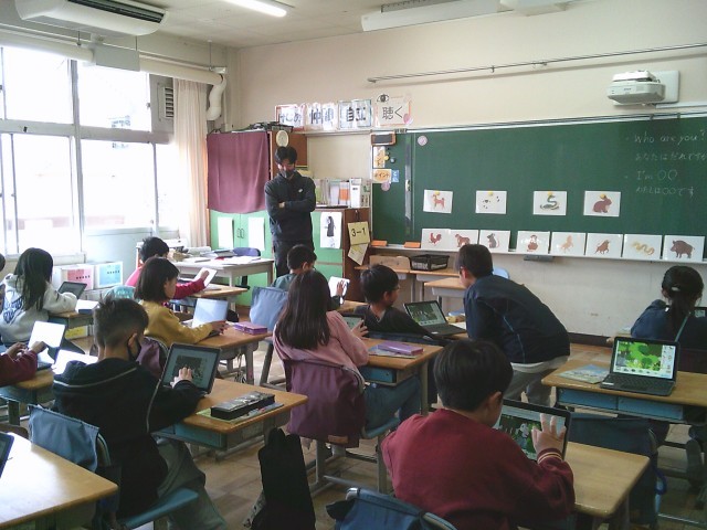 10日(火)4時間目、3年1組は外国語活動の時間でした。今回は、「Who are you?」「I'm ○○」の表現を使って、動物を隠したクイズを作りました。子どもたちはタブレット端末を使って、画面にある草の影や木の後ろに動物の一部だけが見えるようにして問題を作っていました。