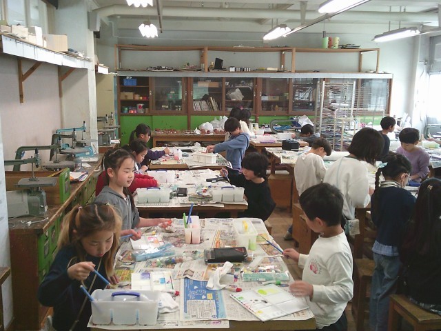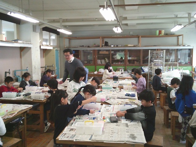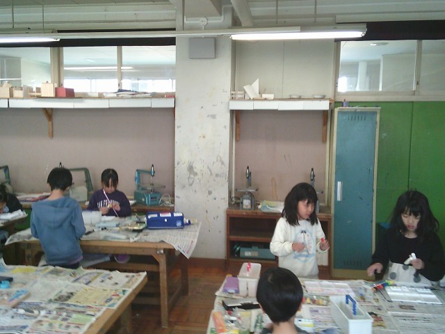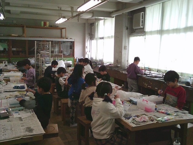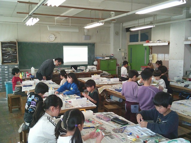 11日(水)1・2時間目、2年1組は図画工作の時間でした。「こころのもよう」と題して絵を描きました。パレットにできるだけ多く「心の色」を作ってから、画用紙に「心の模様」を描きました。子どもたちは混色を楽しんで作っていました。