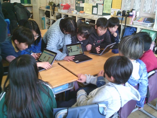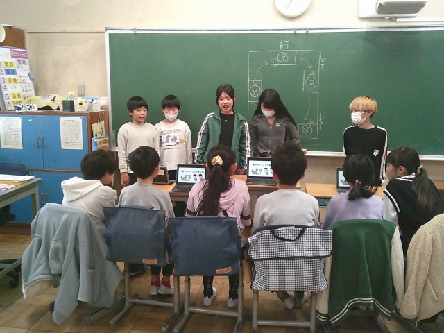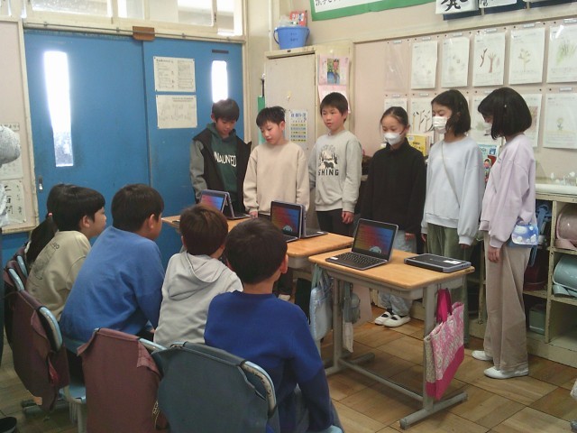 12日(木)6時間目、3年生は4年生の教室を訪問しました。4年生が総合的な学習の時間に地域を歩いて調べた「安全マップ」の発表を聞きました。4年生はタブレット端末にまとめた調査結果を示しながら、3年生に安全なところ、危険なところを伝えました。