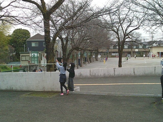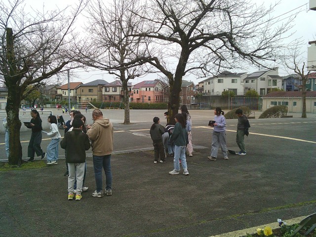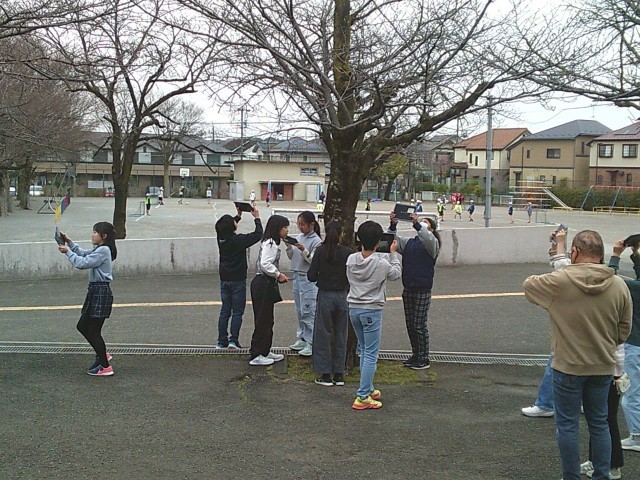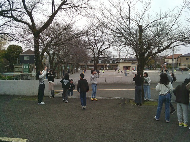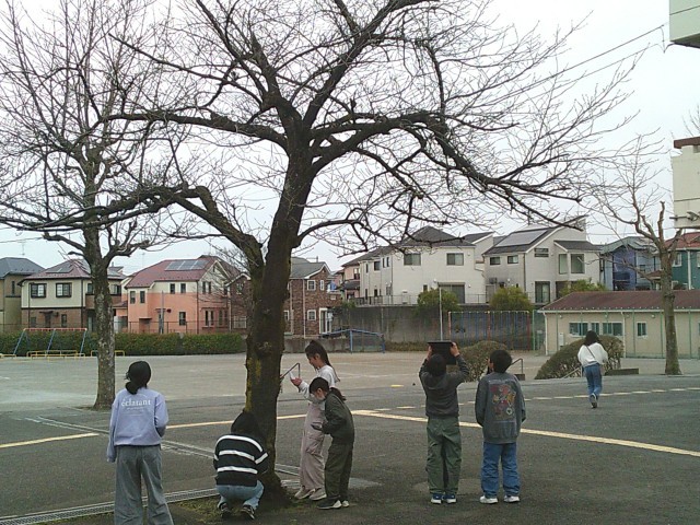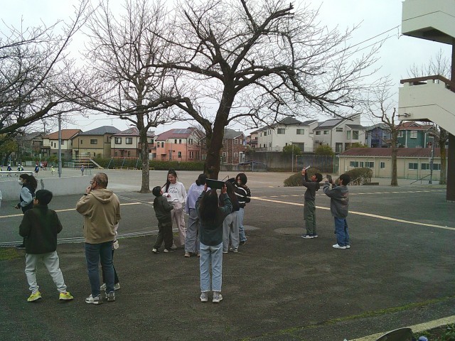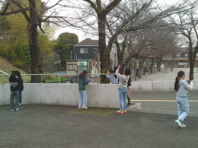 13日(金)5・6時間目、5年1組は理科の時間でした。授業の後半、タブレット端末を手に上校庭のサクラを見に行きました。開花予想によるとあと1週間前後とのことですが、実際はどうなのかという訳でサクラのつぼみを探しました。子どもたちは木を見上げながら、どこかなと探していました。
