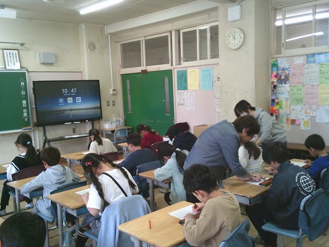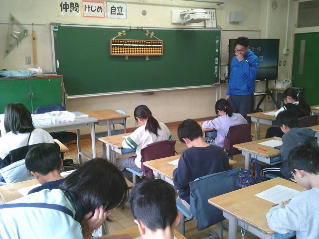 16日(月)3年生は算数の学習の一つとして「そろばん」に取り組みました。講師の先生にお越しいただき、3時間目に2組、4時間目に1組の順でご指導をいただきました。そろばんを初めて触った子がほとんどで、一玉と五玉の動かし方から学びました。
