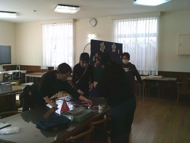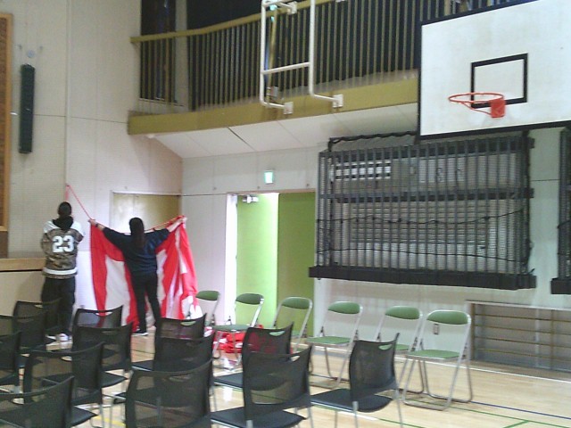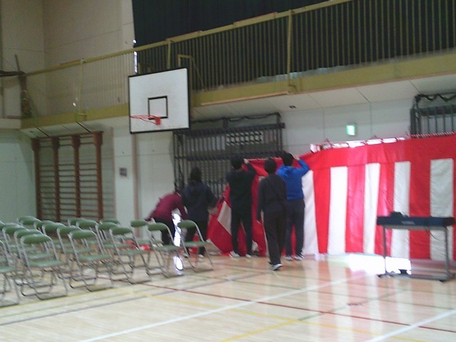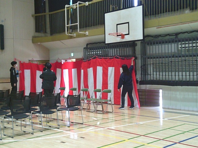 16日(月)放課後、先生たちで卒業式に向けた準備を始めました。体育館では国旗や市旗、紅白幕の取り付け、ランチルームではいただいた祝電の掲示などを行いました。