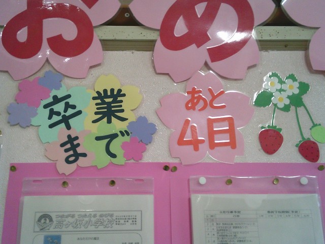 17日(火)、職員用玄関に飾られている生け花がガーベラに変わりました。5本とも色が違いますが、それぞれにきれいです。また、玄関の飾りに「卒業おめでとう」の文字が登場しました。そして、「卒業まであと◯日」の表示が日々更新されています。今年度もあと4日です。