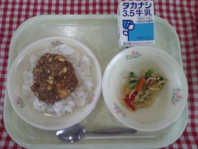 13日(月)の献立は、絹ごし豆腐のマーボー丼、切干大根の彩りサラダ、牛乳です。