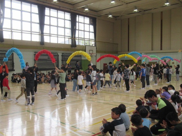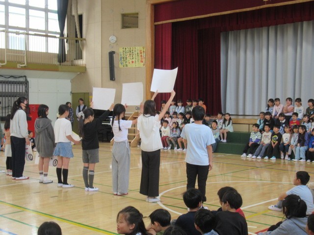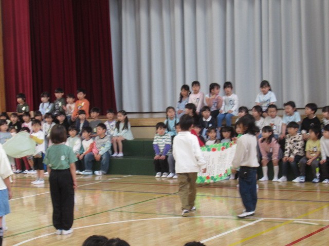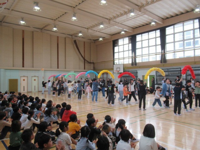 今日は1年生を迎える会がありました。今年度、全校児童が集まるのは初めてのことです。会が始まるとプレゼントがあったり、出し物があったりと楽しい時間になりました。参加している上級生全員の「一年生ようこそ!」という気持ちが感じられ1年生も安心したことでしょう。