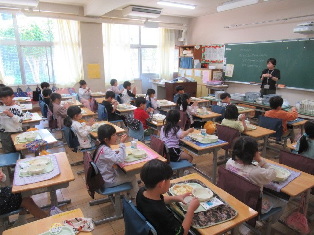 今日は初めての給食。子どもたちも楽しみにしていたチキンカレーです。慣れていないので座席は全員前向きですが、みんな笑顔で食べていました。