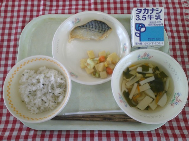 20日(月)の献立は、菜飯、さばの塩焼き、みそドレサラダ、若竹汁、牛乳です。