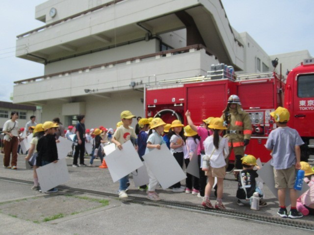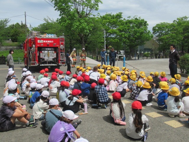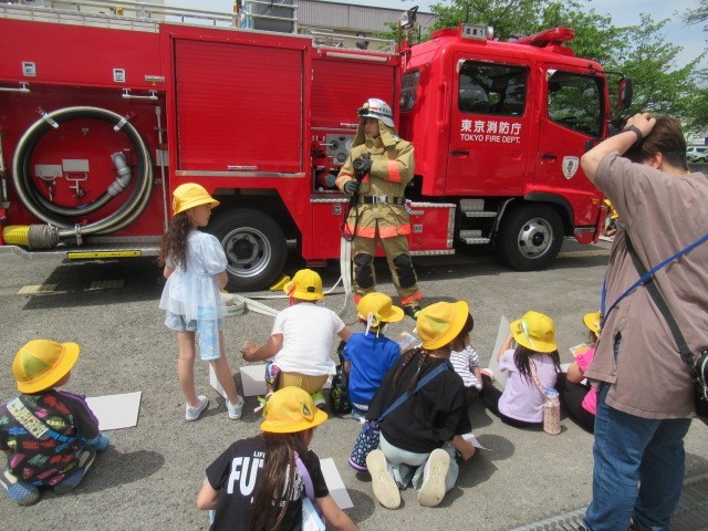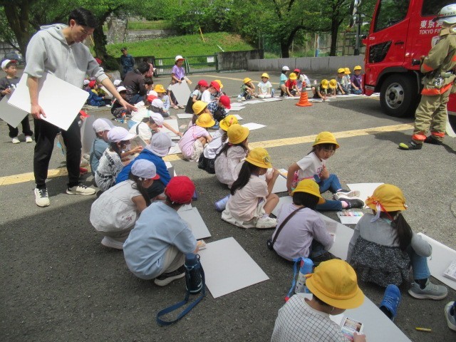 今日は消防署の方が来てくださり、消防自動車の写生会が行われました。近くで見るとさすがに大迫力です。子どもたちはその迫力をしっかりと感じて力強く線を引いて描いていました。楽しい時間を過ごすことができ、どの子も満足そうにしていました。