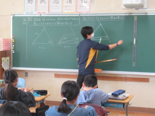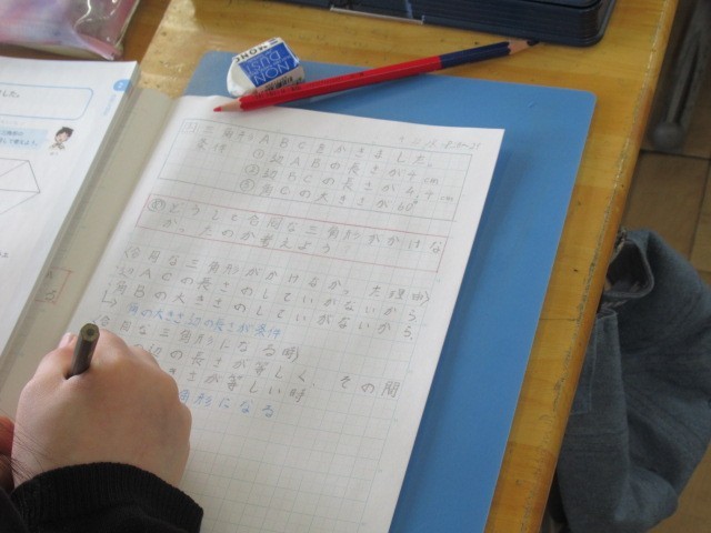 合同な三角形の作図を行っていました。作図をするにはその図形の性質を正確に知っておく必要があります。「なぜ、この方法でかけるのか。」ということを摂津明できることが大切なのです。どの子もきちんとノートを取り、学習内容を積み上げていました。