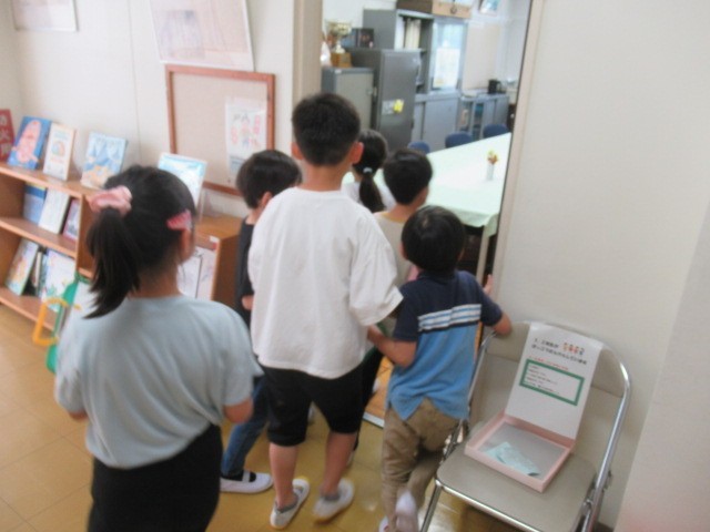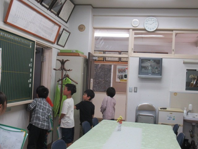 今日は一組さんの学校探検でした。私は校長室で待っていたのですが、きちんとノックをして、あいさつをしてから入ってきます。2年生が1年生をリードして「静かにするんだよ。」「そろそろ行くよ。」などの声掛けをしているのが微笑ましく感じました。