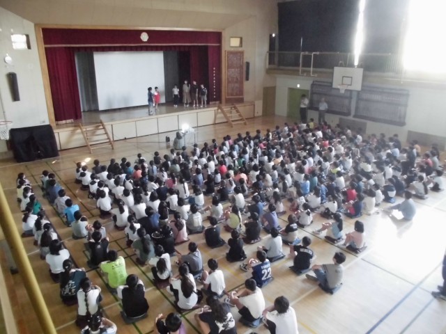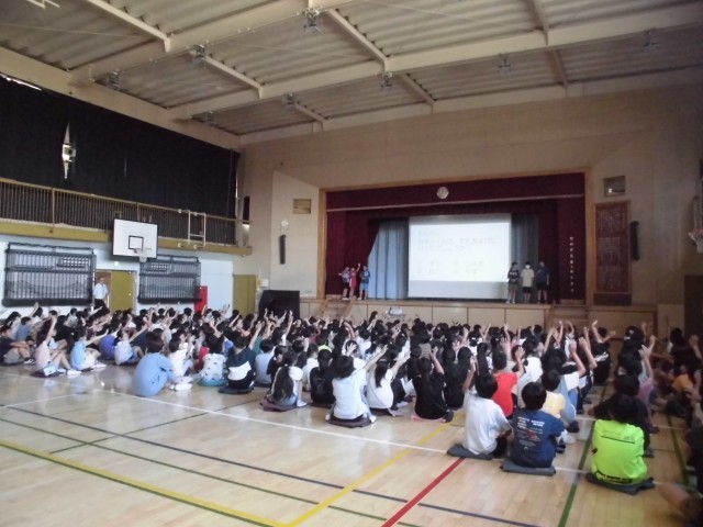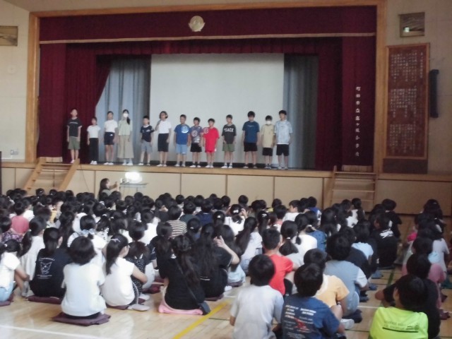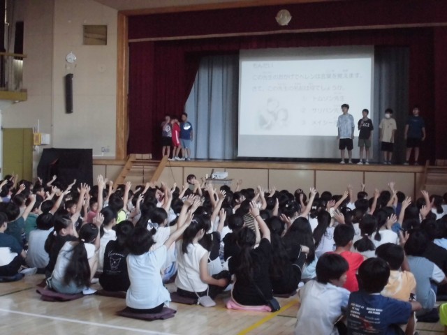 9日(月)の朝は、図書委員会による発表をしました。2学期も本を読んでほしいと伝えるために、3人の「ブックマン」が登場したり、おすすめの本についてのクイズを出したりしました。