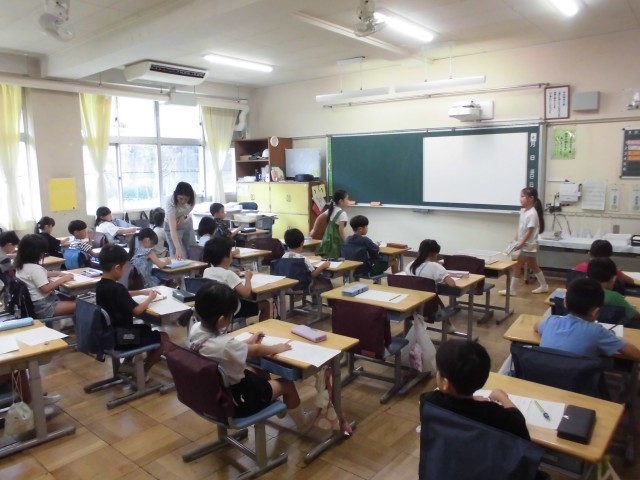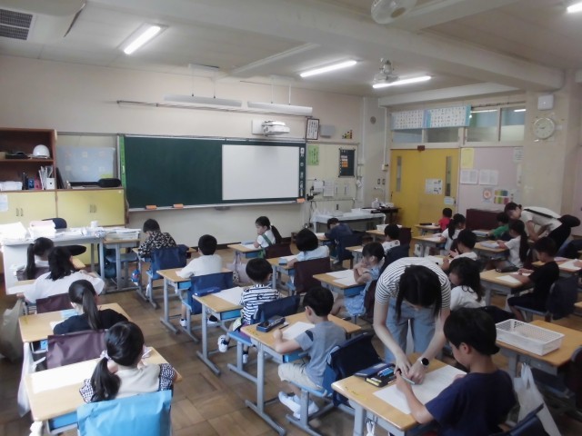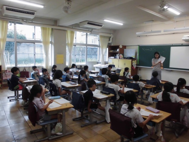 9日(月)1時間目、1年1組は国語の時間でした。「しをかこう」の学習です。夏休みの思い出や家族のことを詩のたねにして、初めて詩を書きました。