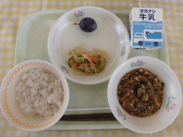 10日(火)の献立は、麦ご飯、マーボーなす、大根サラダ、果物(プルーン)、牛乳です。