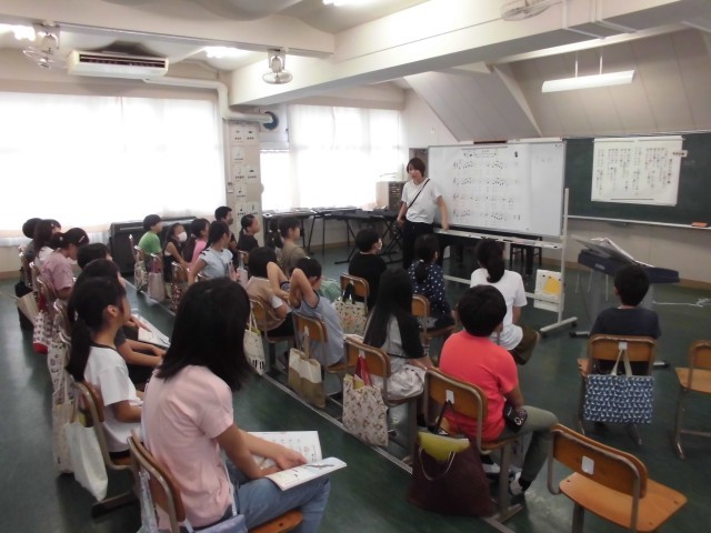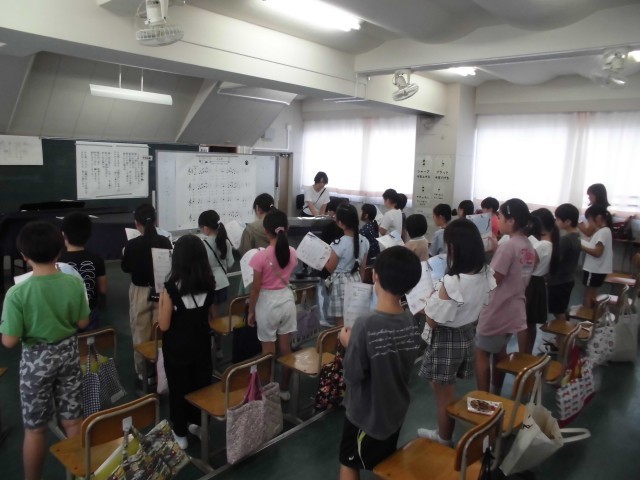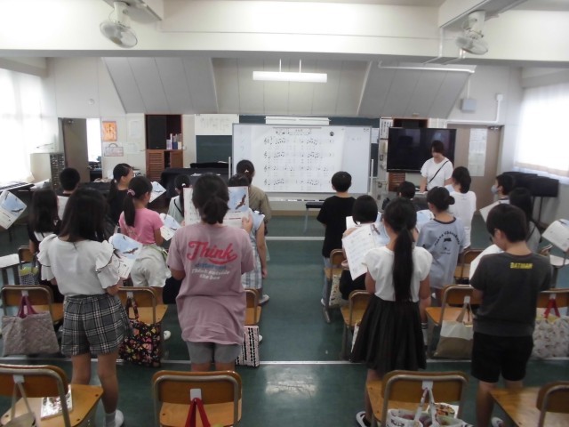 10日(火)1時間目、4年1組は音楽の時間でした。最初に今月の歌を歌いました。次に、教科書に載っている「とんび」の歌を練習しました。1回目は歌詞を付けて、2回目は階名で歌いました。