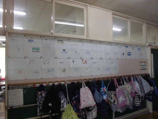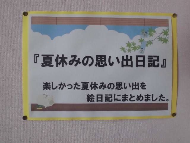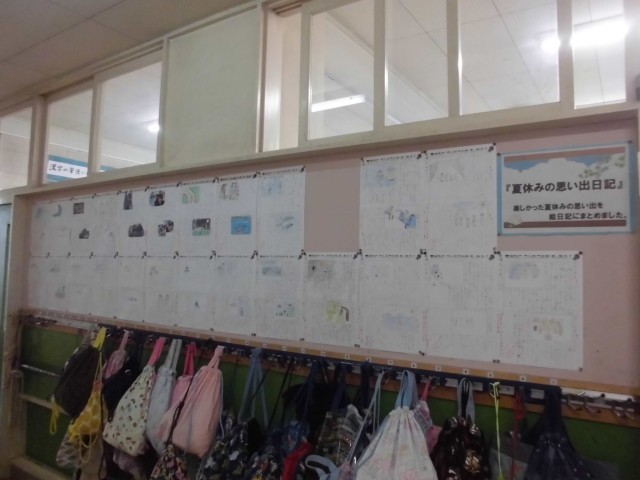 3年生の廊下には、「夏休みの思い出日記」と題した絵日記が登場しました。夏休み中の出来事や自分がしたことが書かれています。