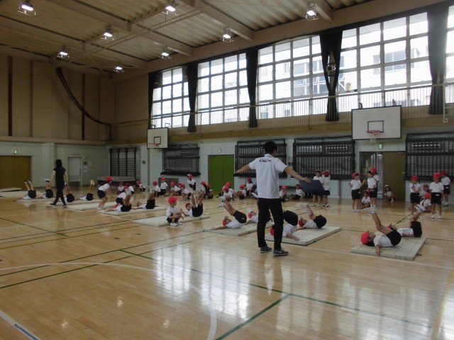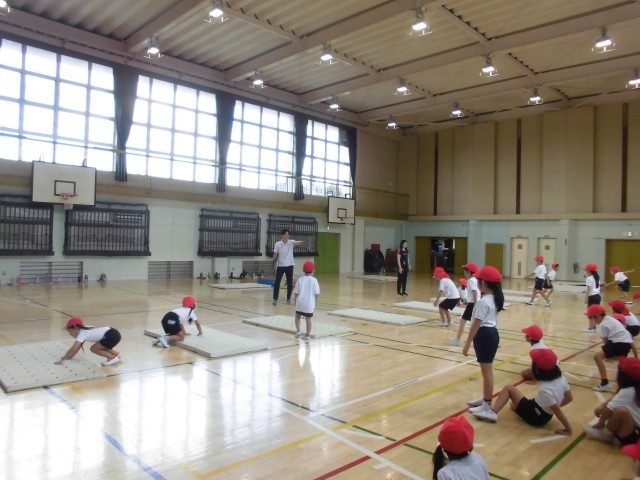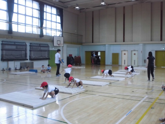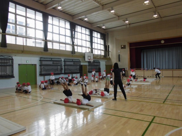 11日(水)2時間目、1年生は合同で体育の時間でした。マット遊びをしました。首倒立をしたり、かわとびをしたりしました。子どもたちは、「マット遊びカード」を持って、練習に臨んでいます。