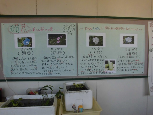 理科室前の廊下の様子です。「顔花」と言われる朝顔、昼顔、夕顔、夜顔の4種類を紹介しています。それぞれの花の特徴が書かれています。