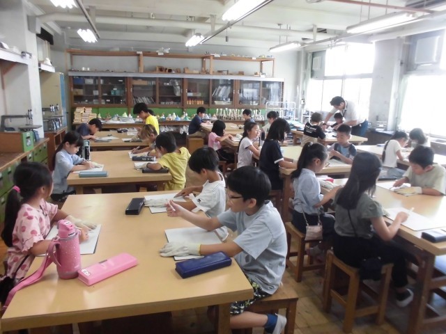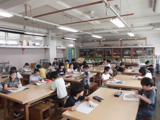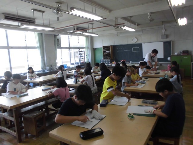 11日(水)3・4時間目、3年1組は図画工作の時間でした。「カッターでつくろう」の学習です。最初に、カッターの使い方の確認をしました。次に、実際にカッターを持って、切り抜きの練習をしました。カッターを持たない方の手に軍手をはめ、紙の下にはカッター用マットを置いて、作業を始めました。