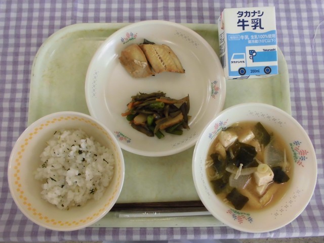 12日(木)の献立は、菜飯、ほっけの香味焼き、五目きんぴら、大根とえのきのみそ汁、牛乳です。
