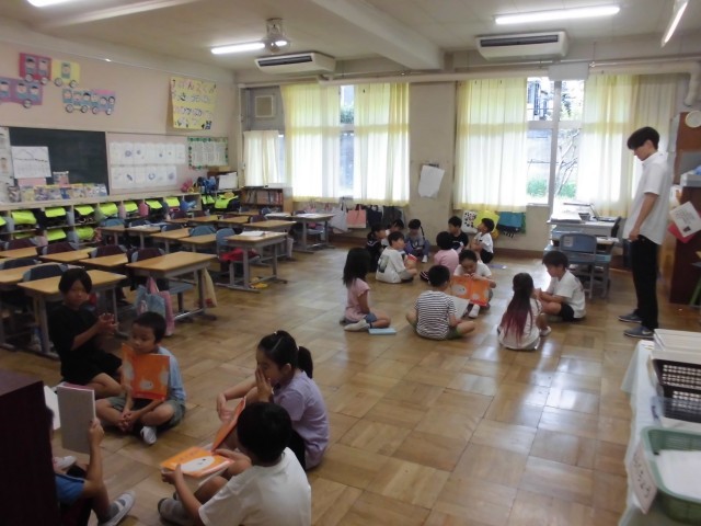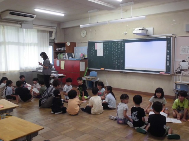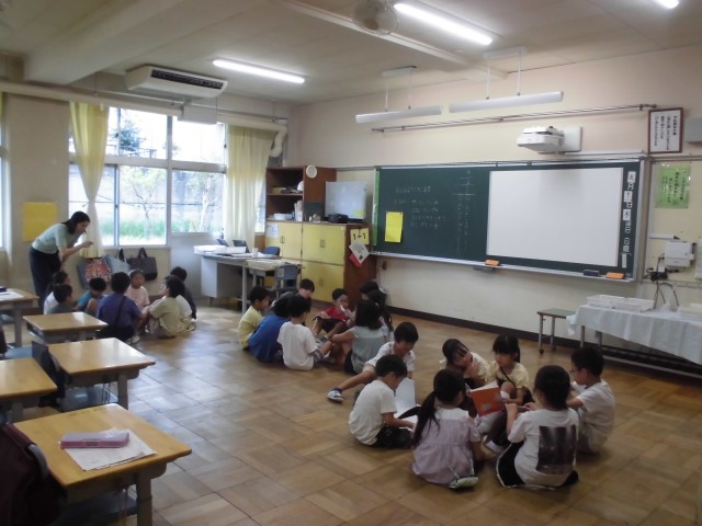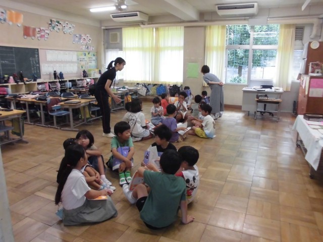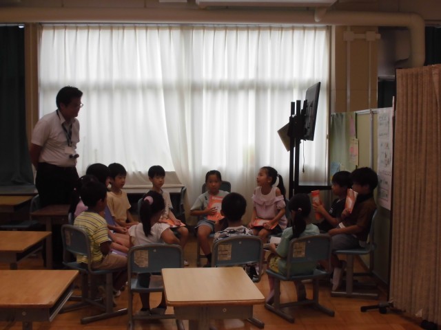12日(木)の高ヶ坂タイムは、サークル対話をしました。たてわり班の1・2年生同士で「夏休みの思い出」をテーマに話しました。2年生はノートに書いた文章を時折見ながら話しました。