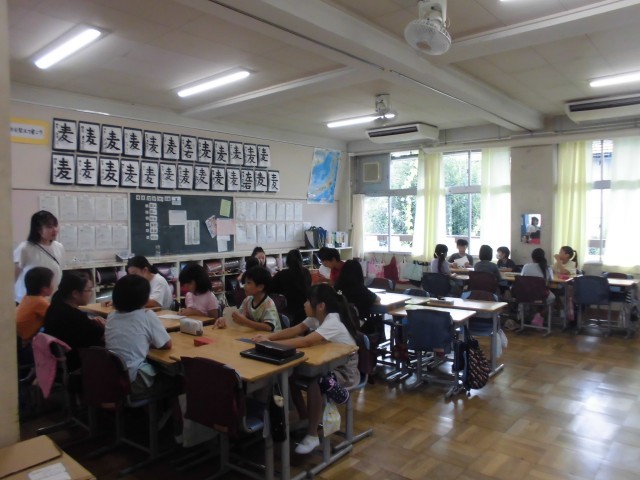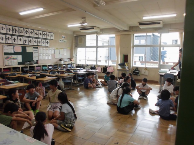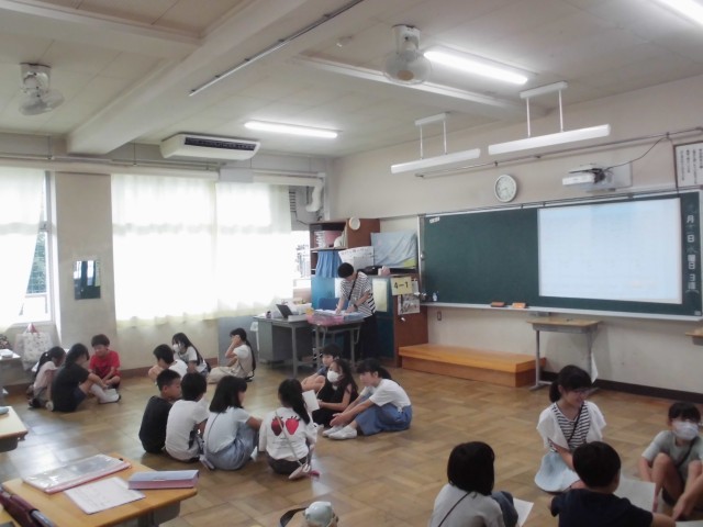 12日(木)高ヶ坂タイムの様子です。3・4年生はサークル対話をしました。たてわり班のグループで「夏休みの思い出」を一人ずつ話しました。各教室にいる先生たちも子どもたちの話を聞いてまわりました。