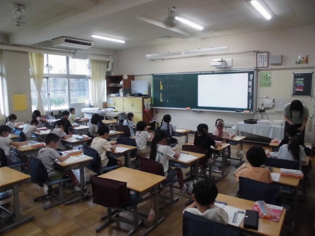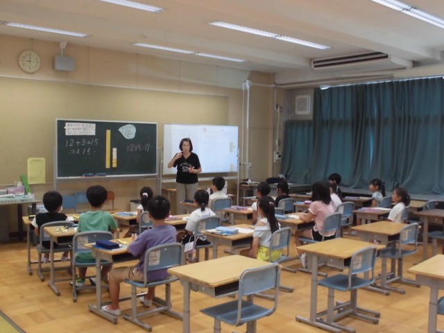 12日(木)1時間目、1年生は算数の時間でした。10より大きい数のたし算の学習が始まりました。今回は、12+3の計算のしかたを考えました。12を10と2とに分けることがポイントです。