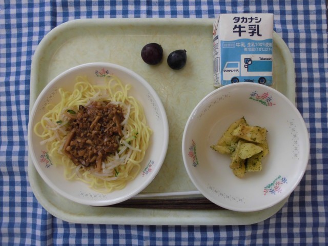 13日(金)の献立は、ジャージャーめん、あおのりポテト、果物(巨峰)、牛乳です。