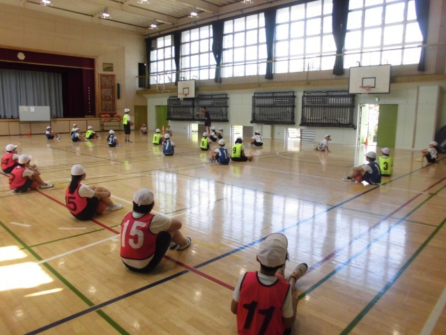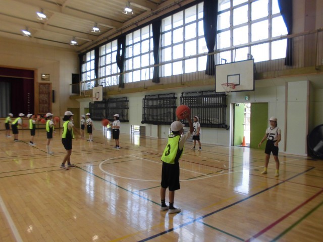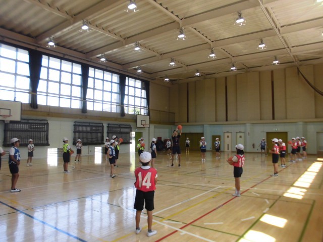 13日(金)4時間目、5年2組は体育の時間でした。1組の先生との学習です。今回はバスケットボールをしました。ワンバウンドでのパス練習や、シュート練習をしました。