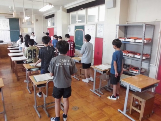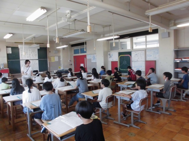 13日(金)4時間目、5年1組は音楽の時間でした。昨日から音楽室の空調施設が動かなくなり、本日からしばらくの間、家庭科室や視聴覚室で授業をすることにしました。今月の歌「夏の日の贈り物」や、「With you smile」の練習をしました。普段とは違う環境ですが、子どもたちは落ち着いて臨んでいました。
