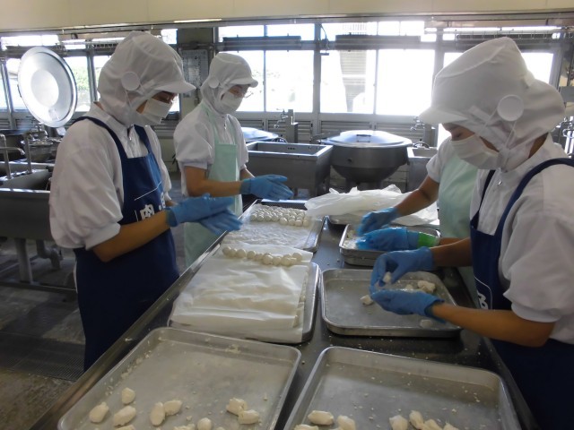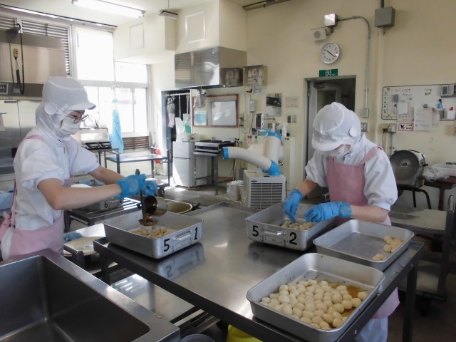 今日は、中秋の名月にちなんで、給食室でお月見団子を手作りしました。粉をしっかりこねて、耳たぶくらいの柔らかさになったら成形していきます。調理員さんたちは手のひらで2個ずつ丸く成形し、あっという間に人数分を作り終えました。