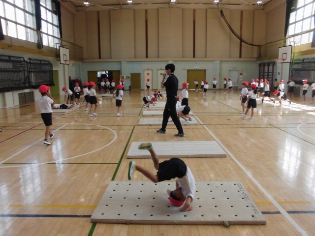 18日(水)2時間目、1年生は合同で体育の時間でした。体育館のフロアいっぱいにマットを並べ、それぞれ練習をしました。後ろ回りは斜面を作って回りやすいようにしています。前の人の練習が終わると「いいよ」と声がかかり、その合図で次の人が練習をする約束です。子どもたちは約束を守り、安全に取り組んでいます。
