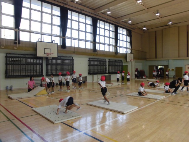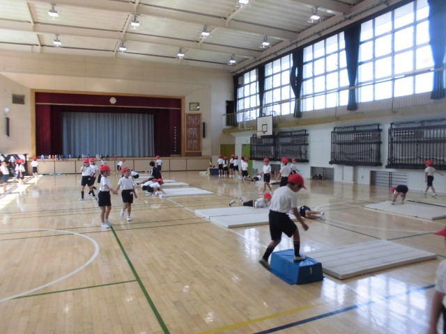 18日(水)2時間目、1年生は合同で体育の時間でした。体育館のフロアいっぱいにマットを並べ、それぞれ練習をしました。後ろ回りは斜面を作って回りやすいようにしています。前の人の練習が終わると「いいよ」と声がかかり、その合図で次の人が練習をする約束です。子どもたちは約束を守り、安全に取り組んでいます。