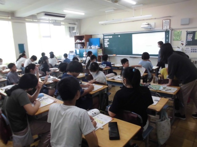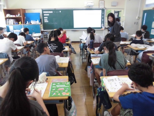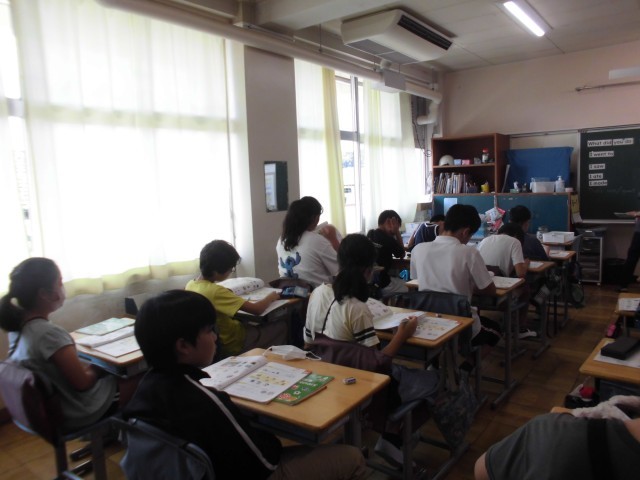 18日(水)2時間目、6年1組は外国語の時間でした。担任の先生をはじめ、ALTやMEPSの先生も一緒に授業をしました。今回は、夏休みにしたことを伝える表現を学びました。その一つとして、出かけたときに使う表現「I went to 〜」を練習しました。