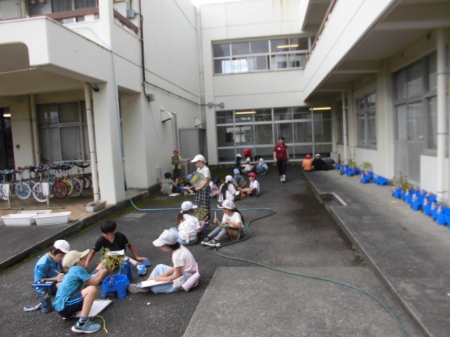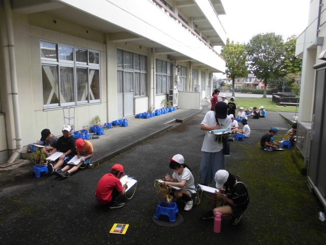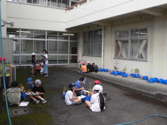 20日(金)1時間目、3年2組は理科の時間でした。上校庭の一角でグループごとにホウセンカの観察をしました。