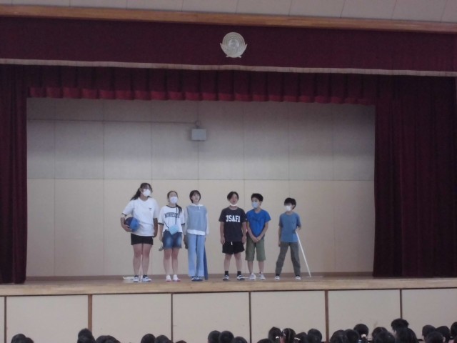 24日(火)の朝は、こどもまつりPR集会をしました。3年生以上の各学級でお店を出すため、全校の子どもたちの前で宣伝をしました。写真は5年1組、5年2組、6年1組、6年2組です。宣伝担当の子どもたちは、3連休前の休み時間にリハーサルをして本日に臨みました。