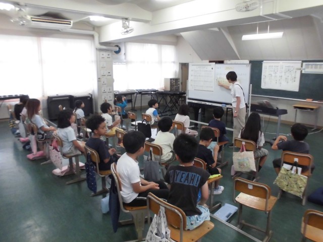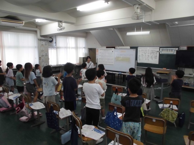 24日(火)3時間目、2年1組は音楽の時間でした。最初に、今月の歌「夏の日の贈り物」を伸びやかな声で歌いました。次に、「いるかは ざんぶらこ」を振りを付けて歌い、3拍子を体全体で表現しました。歌った後は、タンブリングループとカスタネットグループに分かれて、リズム打ちを楽しみました。