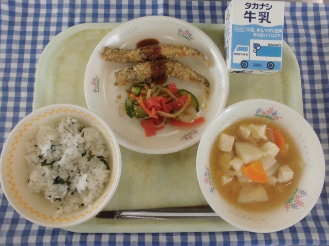 4日(金)の献立は、わかめご飯、ししゃもフライ、こんにゃくサラダ、かぶと人参のみそ汁、牛乳です。