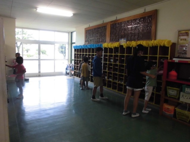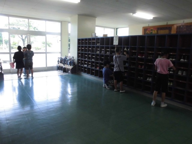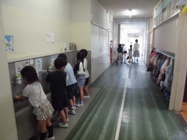 本校では、給食を食べ終えた午後12時55分から15分間、掃除をします。写真は、靴箱や1年1組前の流し、算数教室前の廊下掃除の様子です。