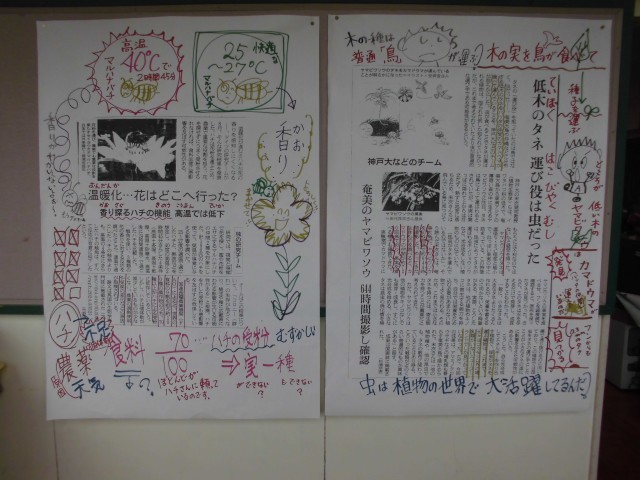 理科室前の掲示物です。講師の先生が折りに触れ、飾ってくださっています。今回は、5年生の学習に役立つ新聞記事に解説を加えた内容でした。