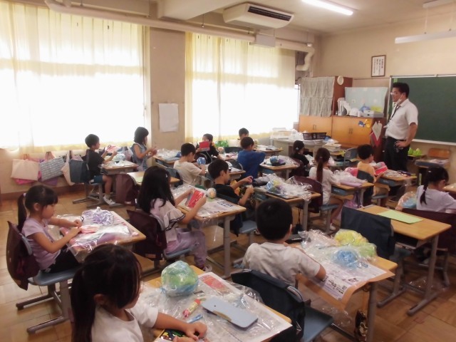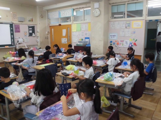 7日(月)3・4時間目、1年2組は図画工作の時間でした。色セロハンを使って「ひかりのくにの なかまたち」と題した作品を作りました。カラーセロハンを手にした子どもたちは、「全部が赤色に見える」「私は全部、青色」と楽しんでいました。そこから想像を広げて形を作っていきました。