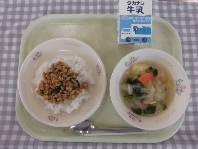 9日(水)の献立は、ソイ丼、野菜スープ、牛乳です。