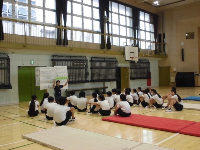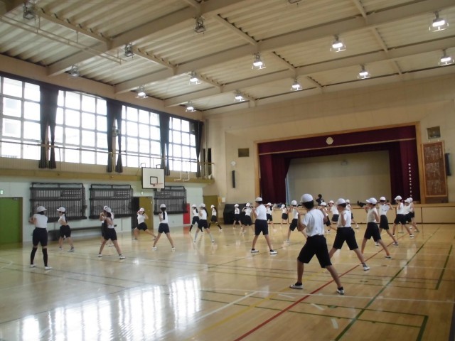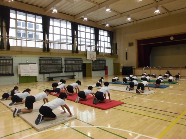10日(木)2時間目、6年2組は体育の時間でした。「マット運動」の3回目です。準備運動は音楽に合わせて行い、運動の構成は担任の先生が考えました。準備運動の最後にコオーディネーショントレーニングのラディアンをしましたが、子どもたちのリズムがそろっていました。自分たちでマットを用意し、手首の柔軟性を高めたり、背倒立をしたりしました。その後、この時間のめあてを確認してから、各自の技の練習をしました。