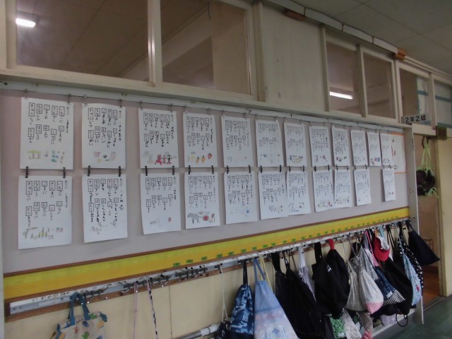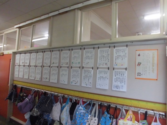 2年生の廊下に、国語の時間に取り組んだ「ことばあそびをしよう」が登場しました。「いちじく、にんじん、」で有名な数え歌のように、子どもたちが自分で考えた数え歌を作りました。学習を通して言葉の世界が広がっています。