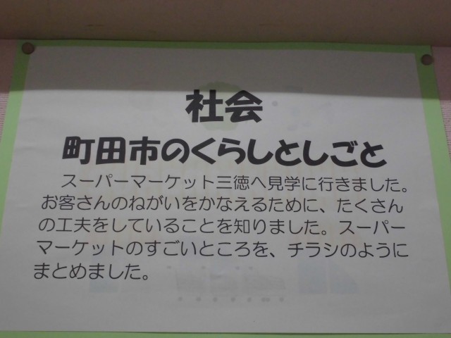 3年生の廊下には、社会の校外学習で見学させていただいた「スーパーマーケット」のことをまとめたものが登場しました。スーパーマーケットのすごいところや工夫しているところをチラシ風にまとめています。子どもたちの絵もすてきです。
