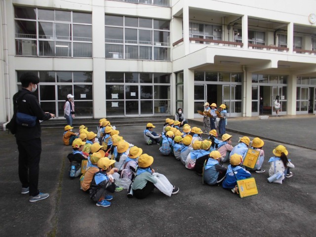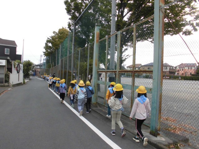 16日(水)1年生は生活科の学習として「かしの木山自然公園」に出かけました。午前8時50分から上校庭で出発式をしました。司会と代表の言葉は1組が担当しました。副校長先生や専科の先生方に「行ってきます」と元気に挨拶をして、午前9時に学校を出発しました。1年生は初めて水色のバンダナを首に巻きました。