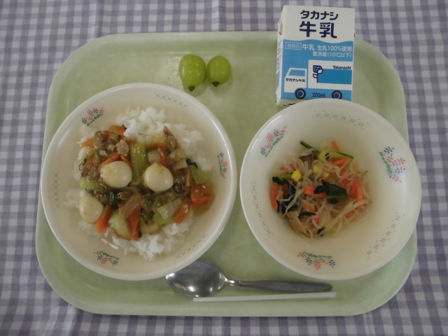 17日(木)の献立は、中華丼、しらたきのツルツル炒め、果物(シャインマスカット)、牛乳です。
