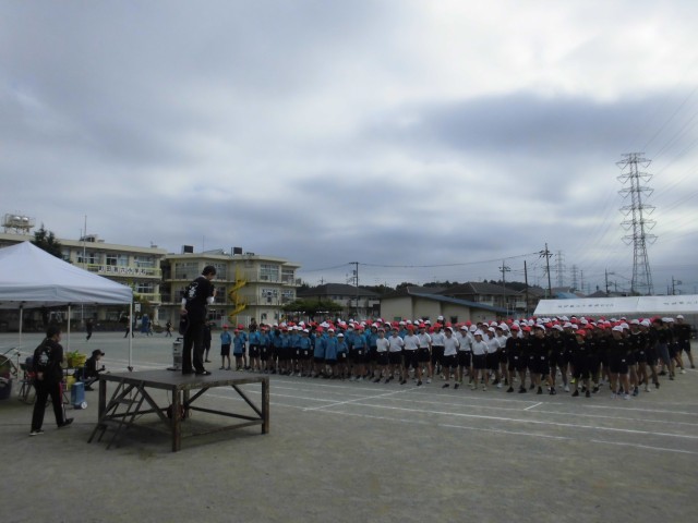 17日(木)6年生は3校合同連合体育大会に参加しました。午前8時20分に上校庭に集合し、専科の先生方に見送られて町田第六小学校に向かいました。会場へは一番乗りでした。真ん中のテントが本校の割当です。9時10分から3校そろって開会式をしました。写真は出発式から、開会式後の準備運動までの様子です。