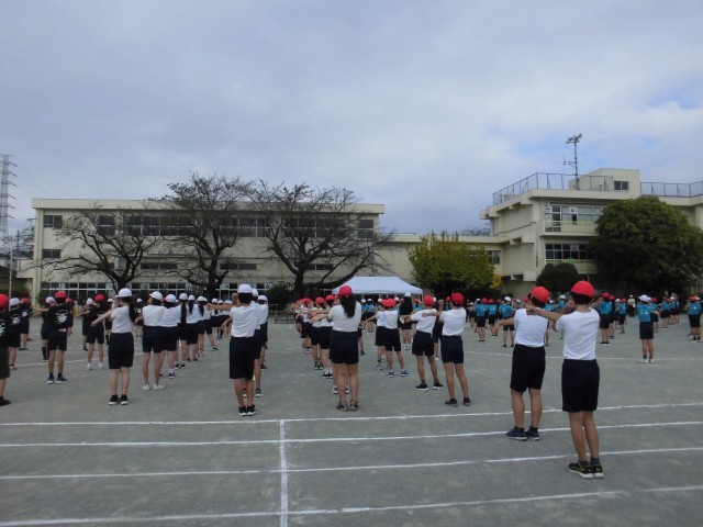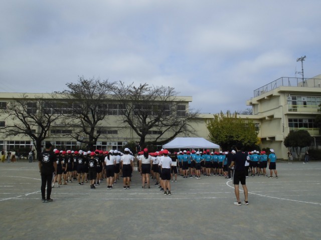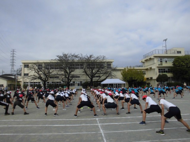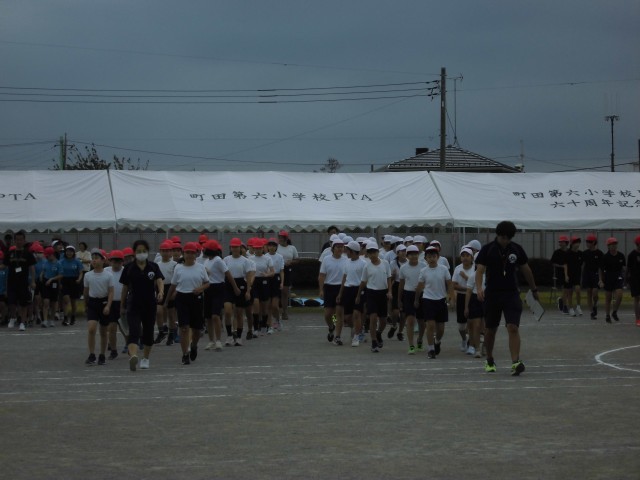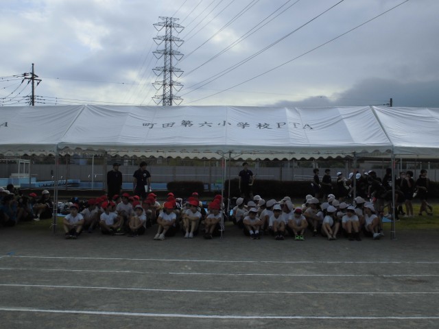 17日(木)6年生は3校合同連合体育大会に参加しました。午前8時20分に上校庭に集合し、専科の先生方に見送られて町田第六小学校に向かいました。会場へは一番乗りでした。真ん中のテントが本校の割当です。9時10分から3校そろって開会式をしました。写真は出発式から、開会式後の準備運動までの様子です。